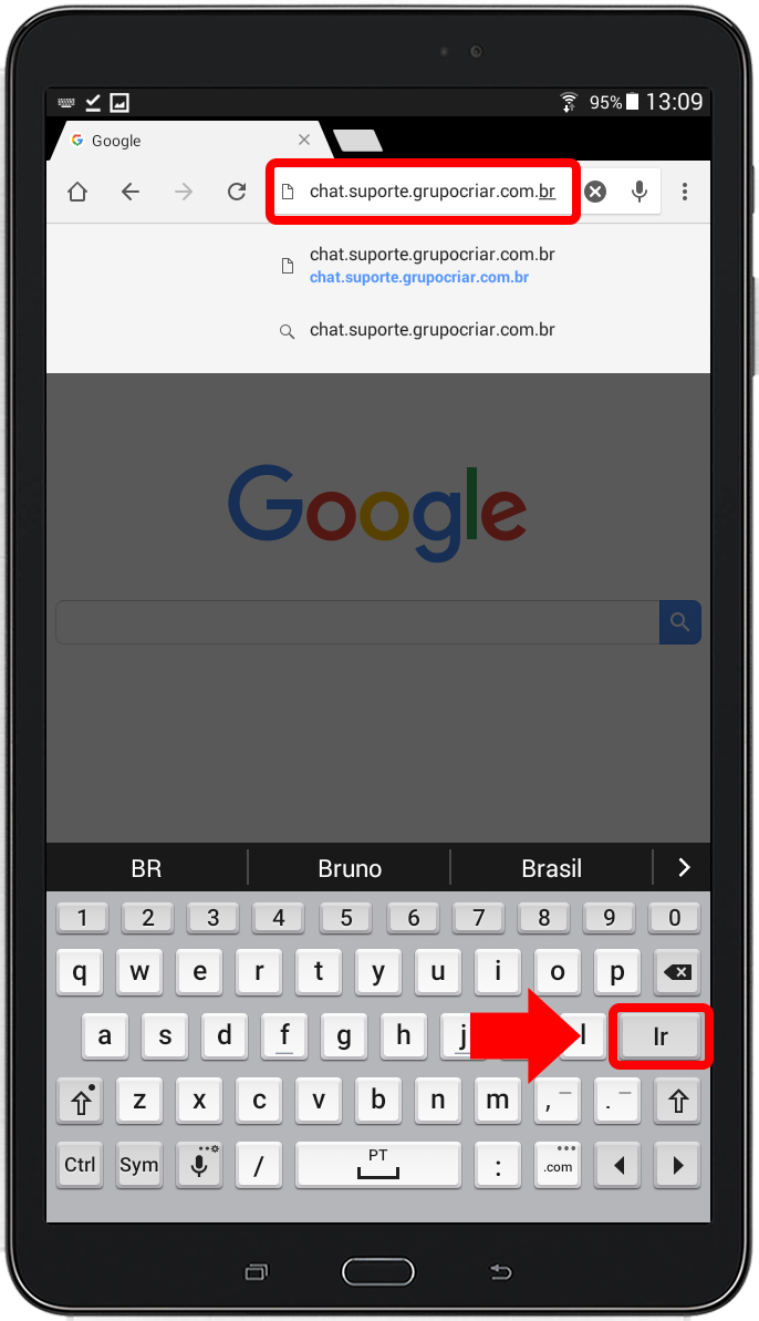 27º – Por meio do navegador de internet, no seu dispositivo móvel (tablet ou celular), digite o seguinte endereço: http://chat.suporte.grupocriar.com.br. Clique em “Ir”.