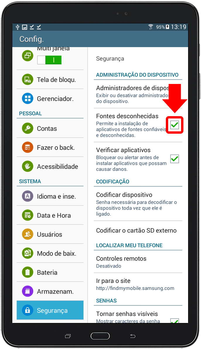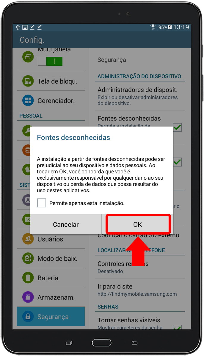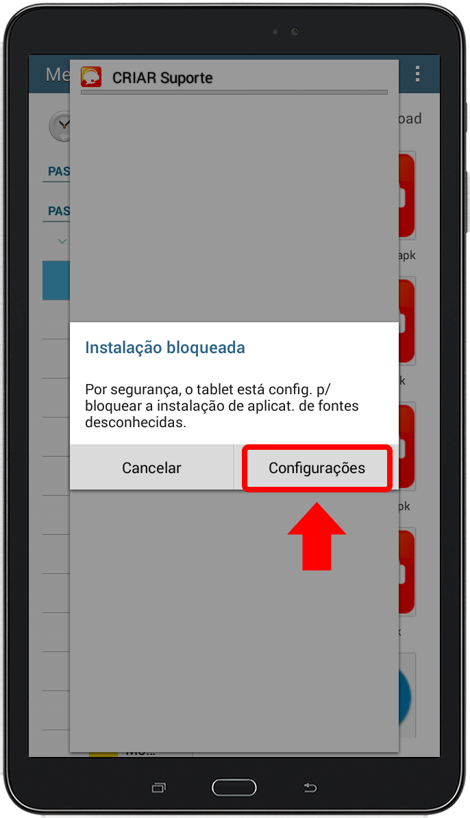 4º – Caso a instalação esteja bloqueada, um aviso de alerta é exibido na tela. Caso contrário, continue no item nº 7 deste tutorial. Clique em “Configurações”.