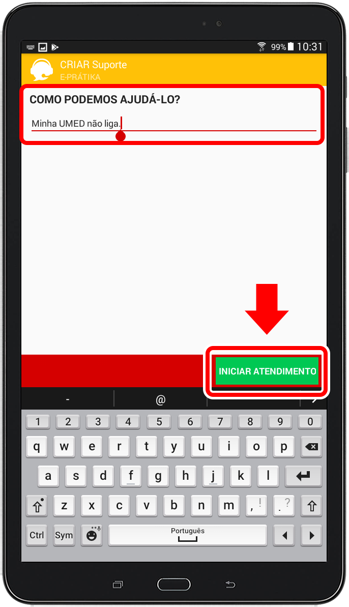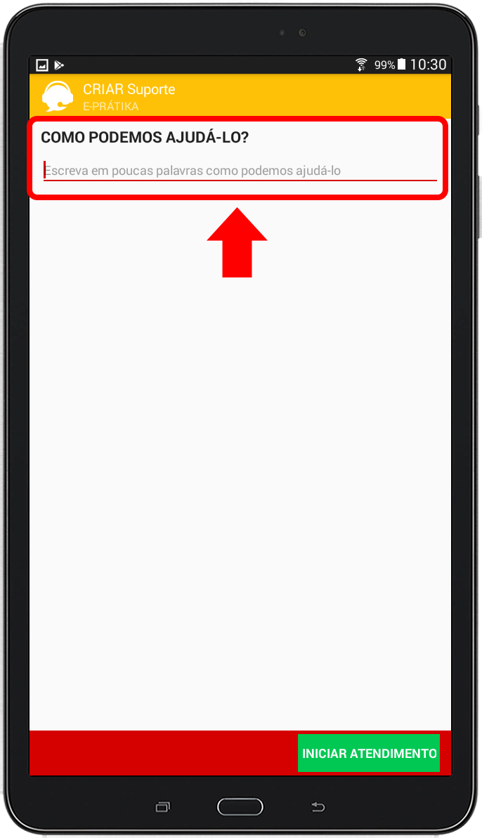 45º – Escreva sua dúvida em poucas palavras e clique em “Iniciar Atendimento”.