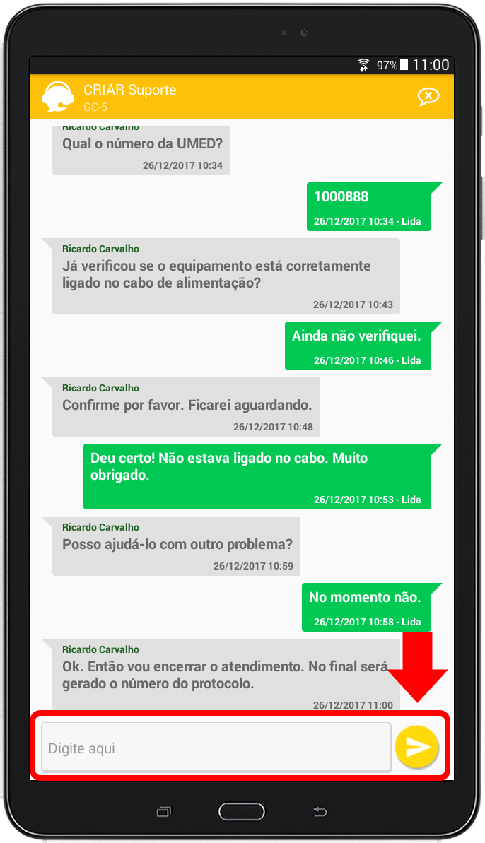 17º – No exemplo abaixo, a conversa via chat alcançou êxito para a solução do problema. O Operador do Suporte informa que o atendimento será encerrado, gerando o número de protocolo.