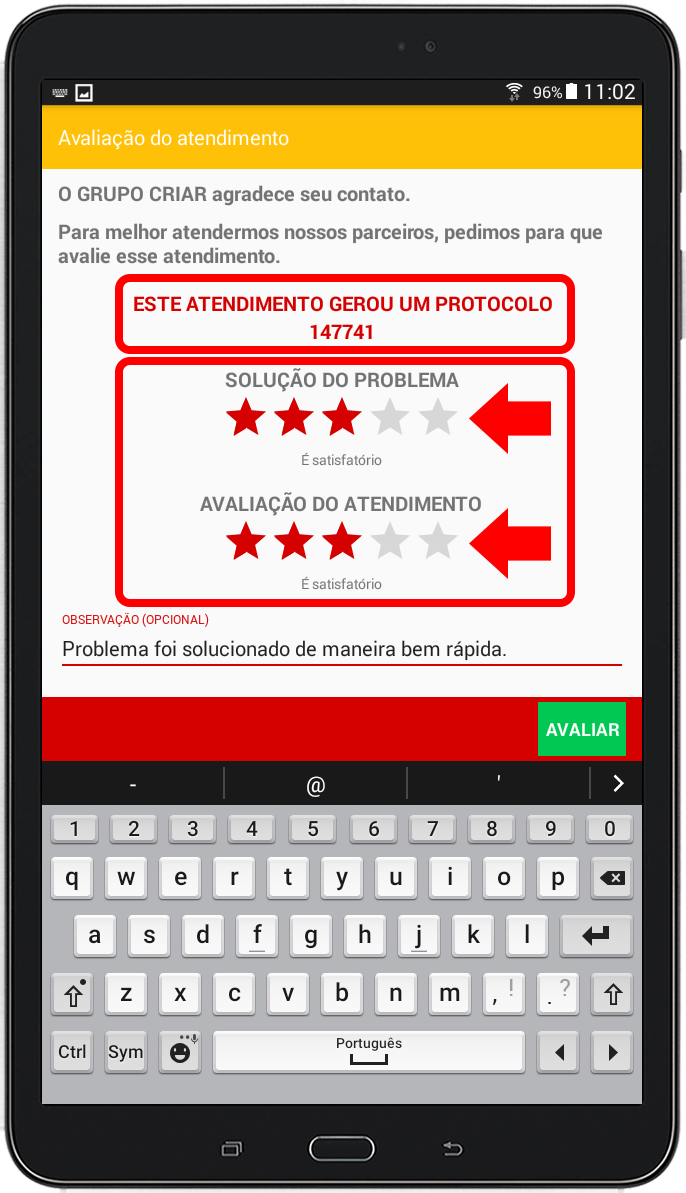 19º – Na tela é informado o número de protocolo. Para avaliar o atendimento recebido via chat, atribua a quantidade de estrelas, podendo também escrever uma observação (opcional).
