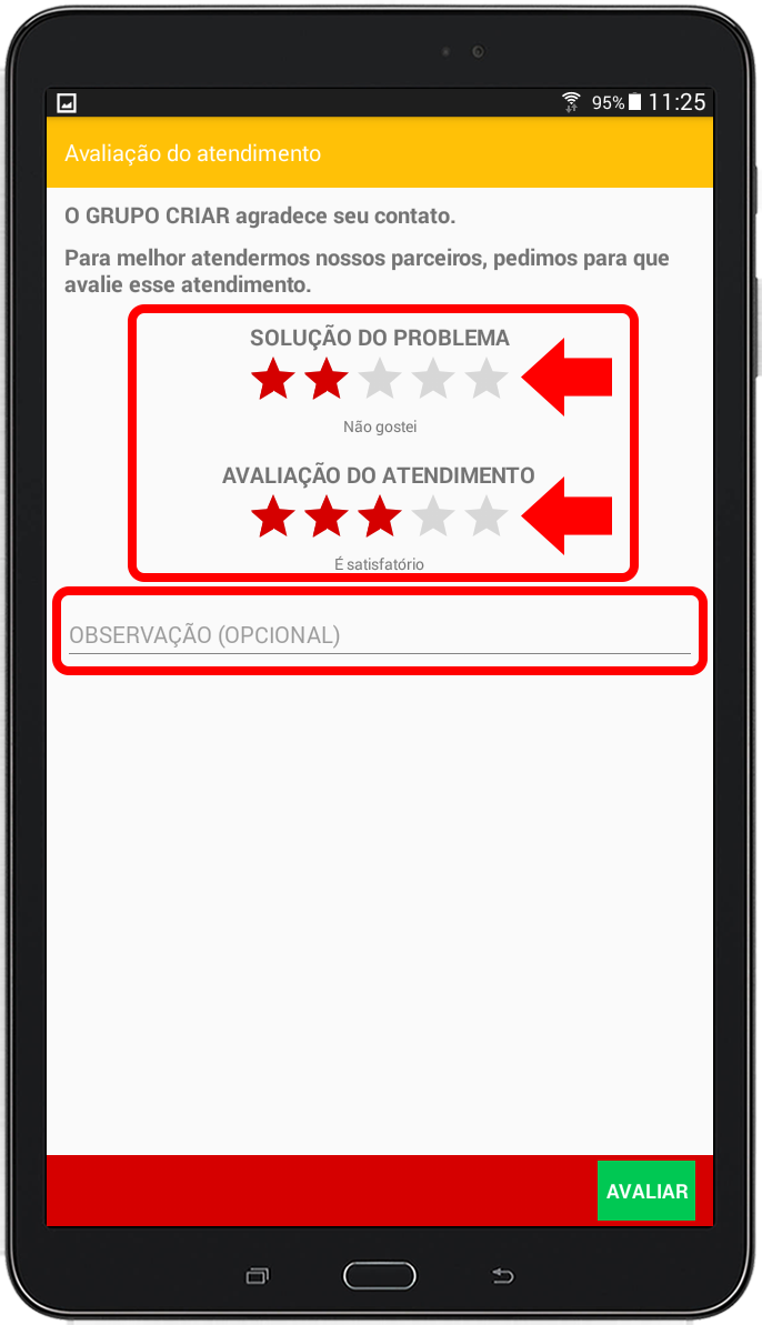 24º – Para avaliar o atendimento recebido via chat, atribua a quantidade de estrelas, podendo também escrever uma observação (opcional).
