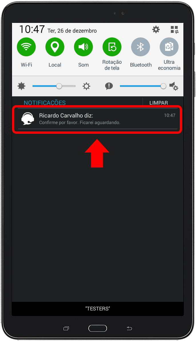 26º – As notificações de mensagens do atendimento via chat também podem ser verificadas na área padrão de notificações do sistema operacional do tablet ou celular, conforme abaixo, permitindo acessar o aplicativo do chat por este local.